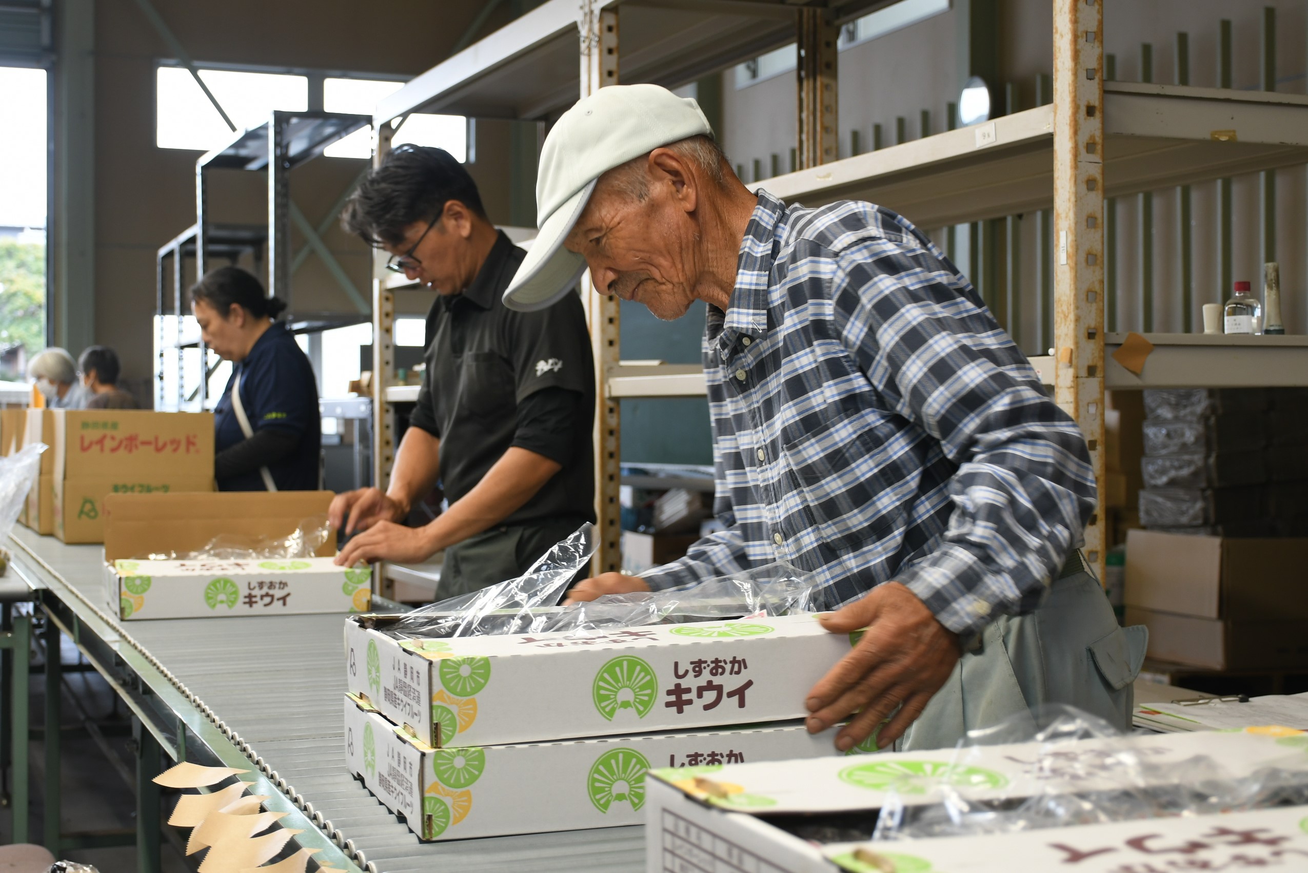 キウイフルーツ委員会が長田集出荷場で、「レインボーレッド」の初出荷を行いました。初日は8人が約2.2tを出荷し、JA職員が一つずつ手作業で実の硬さや傷の有無などを確認しました。販売担当者は「暑さにより、日焼けや落葉を心配したが、予想以上に収穫量もあり出来が良い。流通期間が短く希少なので、スーパーで見つけたら、ぜひ手に取って食べてもらいたい」と話しました。レインボーレッドは、平均糖度20度前後と大変甘くなり、酸味が少なく、果肉が中心から赤身を帯びているのが特長。じまん市や県内の市場へ出荷します。