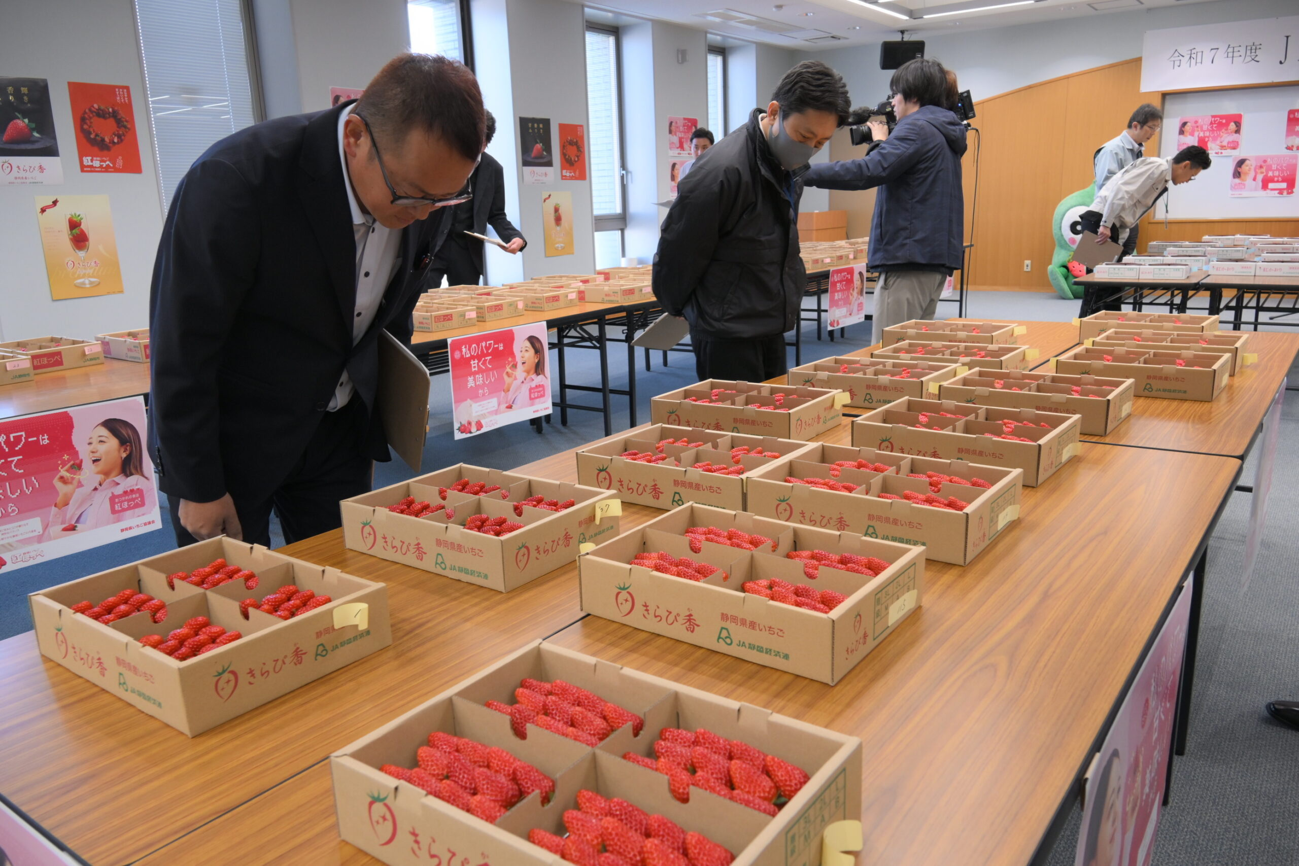 JA静岡市苺委員会がイチゴの振興と栽培・調整技術向上を目的に「いちご祭り」を開催し、果実品評会と支援学校への寄贈、即売会を行いました。品評会には、「紅ほっぺ」43点、「きらぴ香」16点に加え、2024年に品種登録された「紅かおり」9点が出品され、増田安昭さんの「紅ほっぺ」が金賞一席に輝きました。