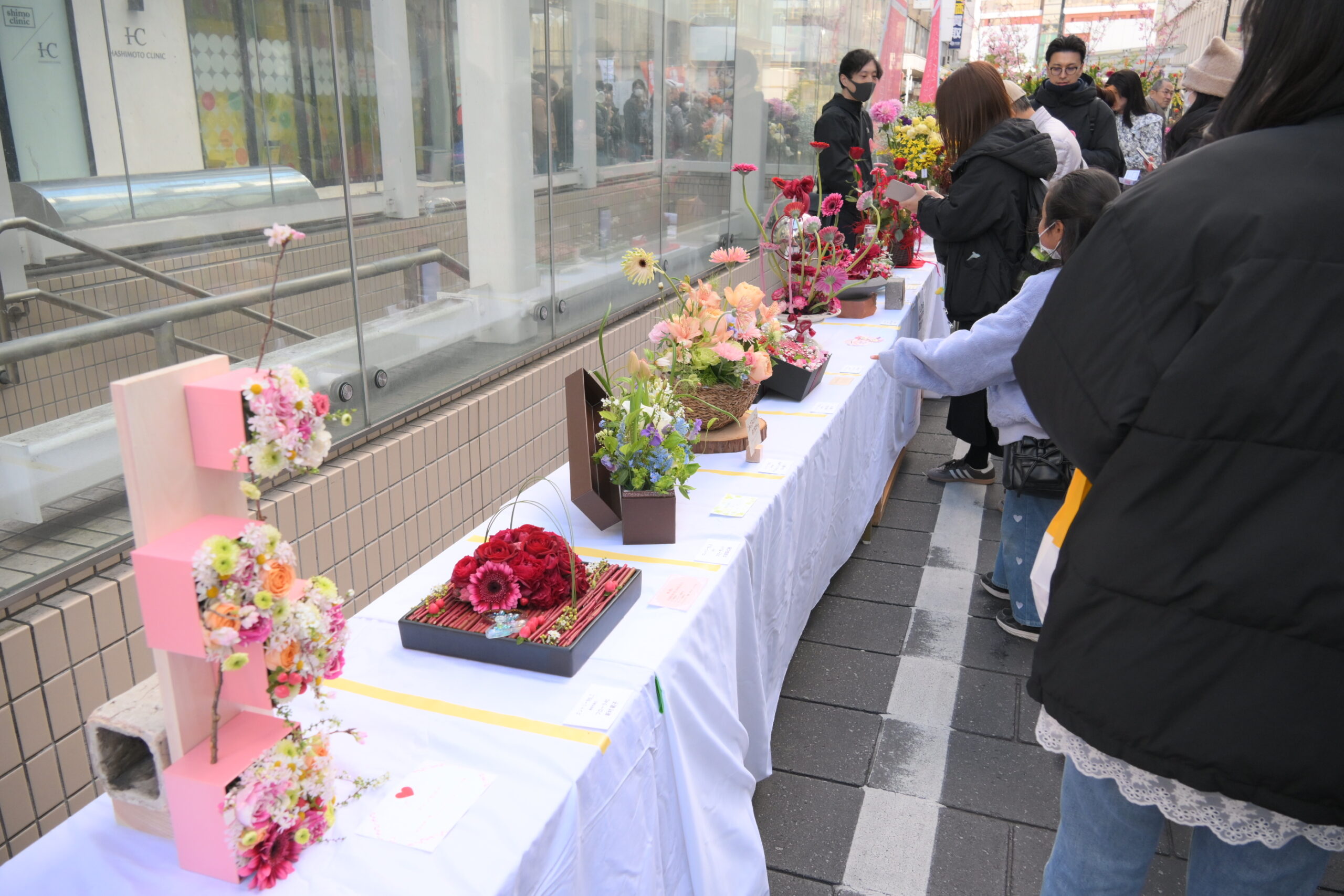 静岡パルコ前で「フラワーバレンタイン」イベントが開催され、フラワーパフォーマンスユニットgram.によるフラワーパフォーマンス、県産の花の展示・販売、アレンジメントコンテストなどが行われました。花束パフォーマンスでは、県内のフローリストがその場で花束を次々と作成し、“花を贈りたい人がいる”観覧者へプレゼント。花束を手にした市内の夫婦は、「すごく素敵なイベント。静岡でこんなに綺麗なお花が作られているとは知らなかった」と笑顔で話しました。