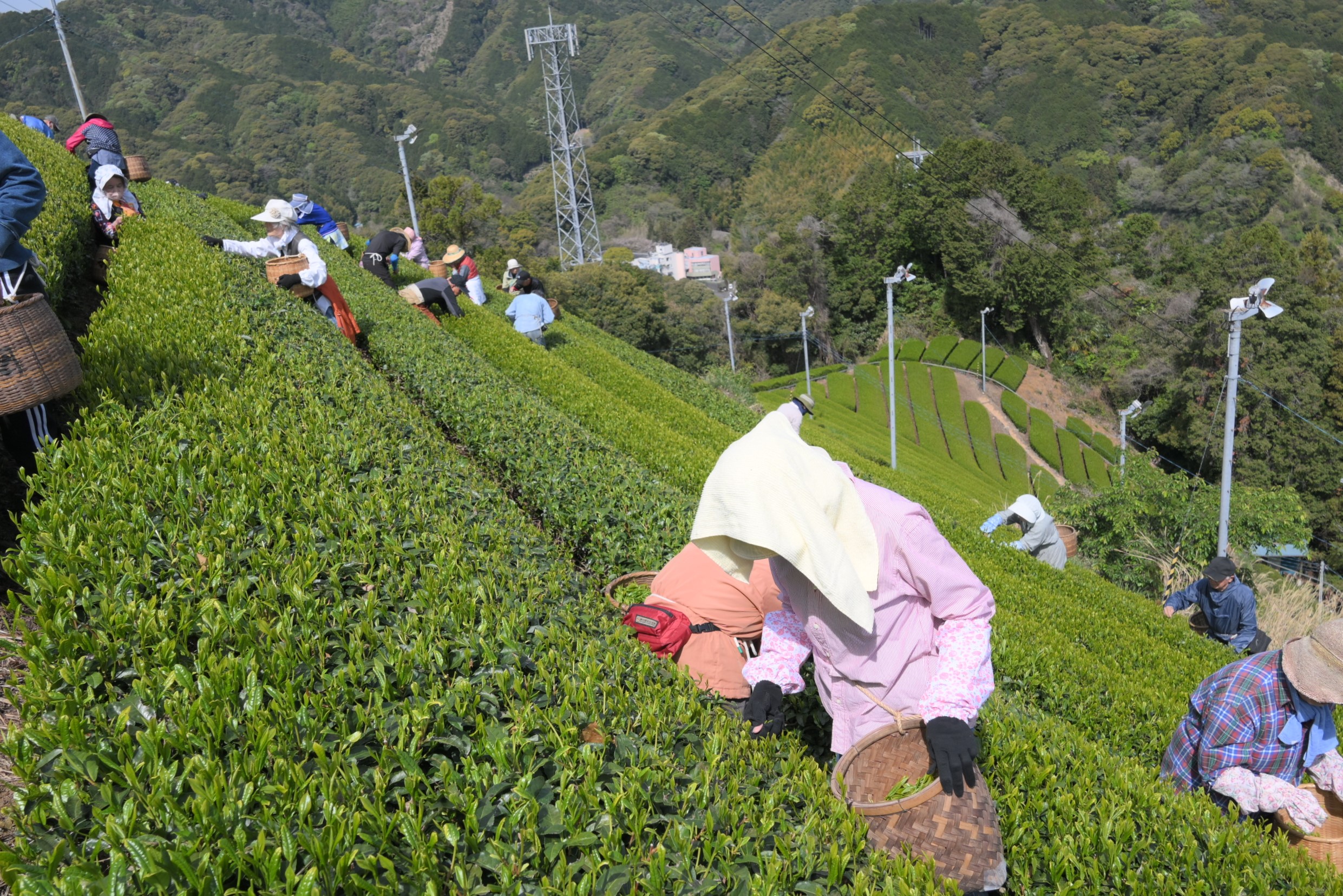 駿河区丸子の松川洋平さんの茶園で「近藤早生」の初摘みが行われ、地域住民ら約30人が作業に当たりました。「近藤早生」は40年ほど前に同地区で発見された品種で、花のような甘い香りと濃厚なうま味が特長。この日は約150㎏を手摘みしました。松川さんは「少雨の影響を心配したが、3月からの雨と気温の上昇で遅れを取り戻し、いい芽が揃った」と話しました。