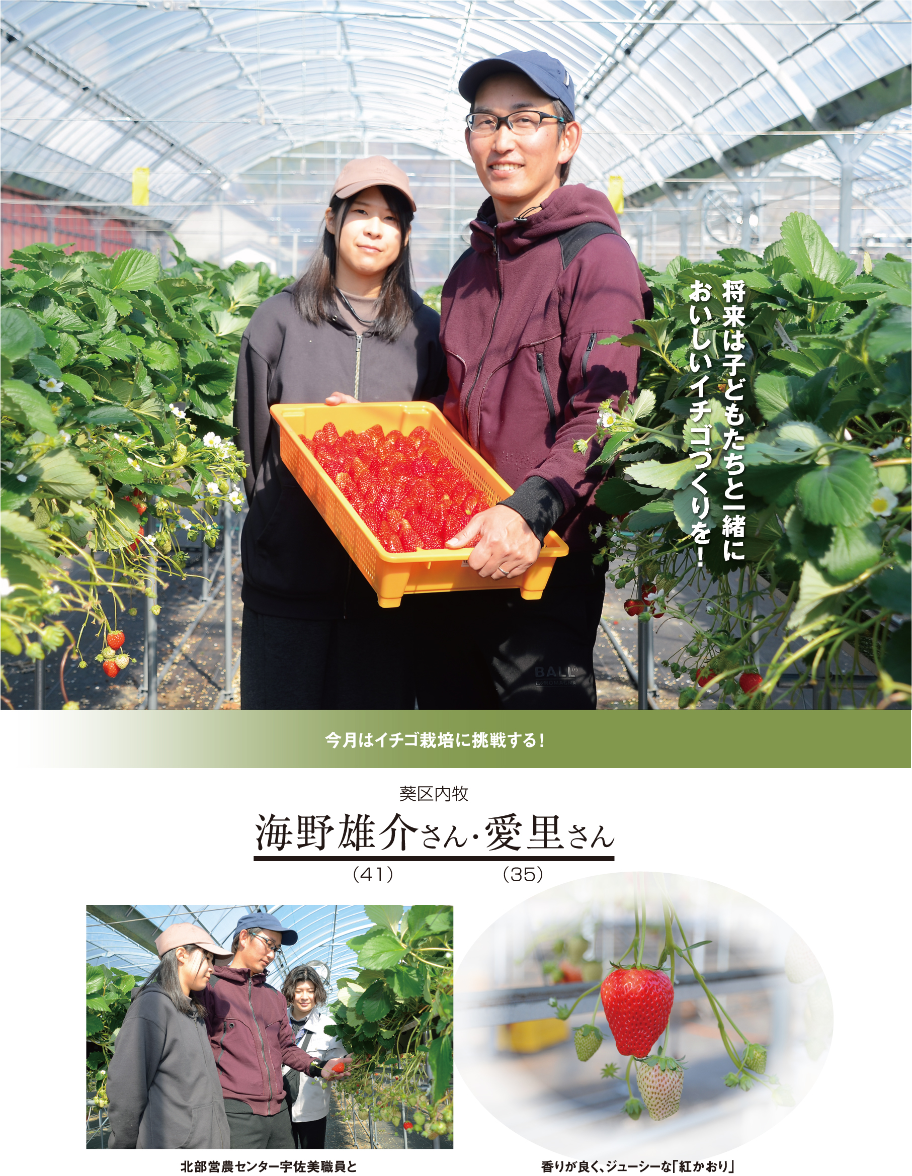 「イチゴは成長が目に見えて楽しい」と話す二人は、イチゴの頂花を「長女」、2番目を「次女」と呼び愛情を込めて育てています。休日は子どもたちと出かけたり、夫婦でラーメン屋巡りを楽しんだりと息抜きも大切にしています。将来は、子どもたちと一緒にイチゴづくりをすることが夢。祖父から受け継いだ土地で技術を磨きながら、おいしいイチゴを次世代に引き継いでいきたいと考えています。