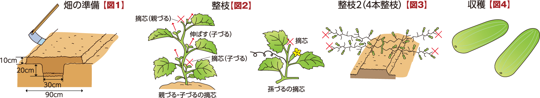 シロウリは孫づるに着果する性質があるため、摘心して孫づるを多く出させます。まず、親づるは本葉5、6枚でつる先を摘み、上の節から出る子づるを4本伸ばします。その後、子づるを8~10節で摘み、それぞれの孫づるは2葉を残して摘心します【図2】。