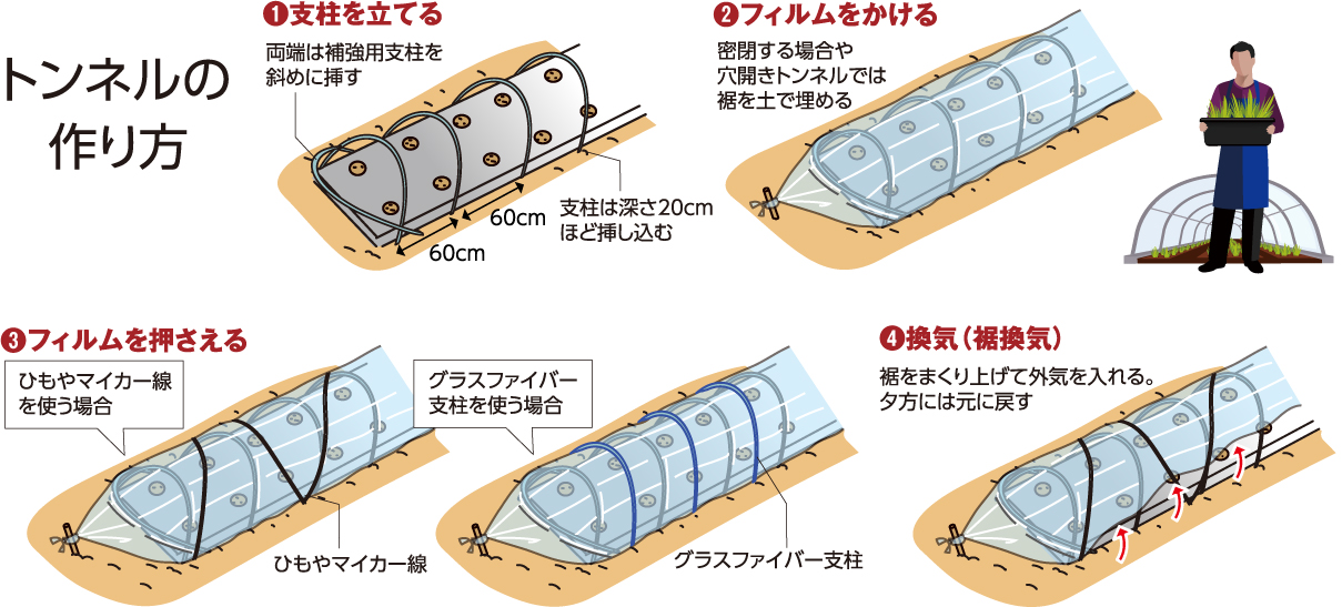 春に向かって光が強くなったら、トンネル内は30度を超えるため、温度が上がり過ぎないように換気をします。フィルムの裾を開閉する「裾換気」と、フィルムに直径10㎝程度の穴を開ける「穴開け換気」があります。資材の再利用や換気の手間を考え、種まき時期にかかわらず穴開き率(フィルム表面積に対する穴開き面積の割合)1、2%程度の資材を選択すると換気の手間を省けます。