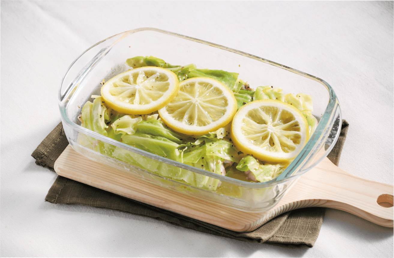 レンジで蒸すだけ、ビタミンたっぷり♪キャベツと鶏のレモン蒸し